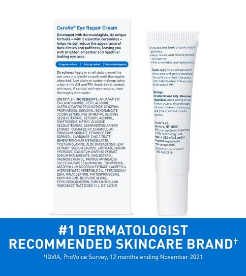 CeraVe Eye Repair Cream is ophthalmologist-tested and features a non-greasy, fast-absorbing, fragrance-free formula that works to minimize the appearance of dark circles and eye puffiness.